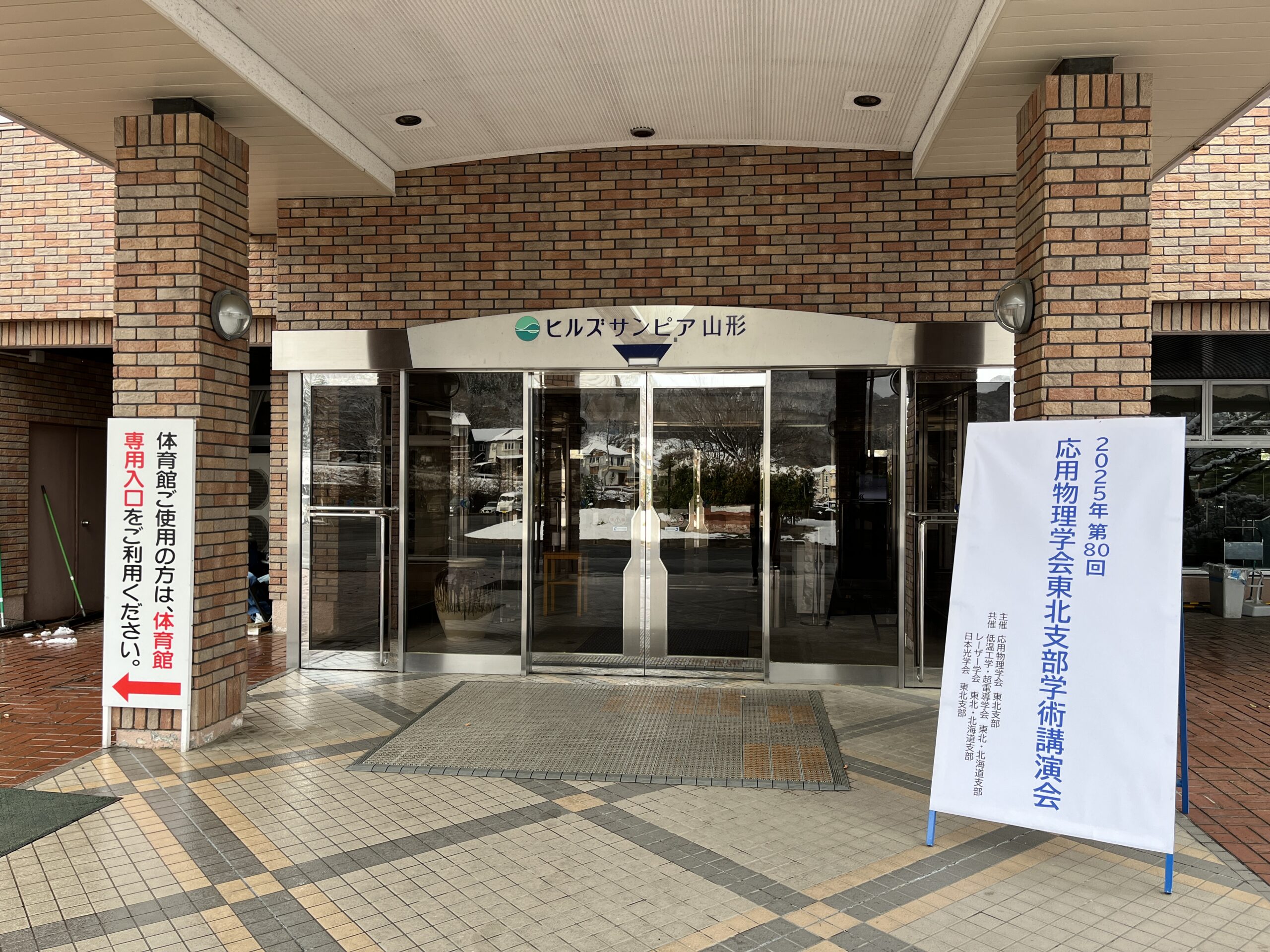 2025年12月4日(木)・12月5日(金) ヒルズサンピア山形(〒990-2333 山形市蔵王飯田637)にて2025年応用物理学会東北支部 第80回学術講演会が開催されました。今年度は放射線、光・フォトニクス、薄膜・表面、ビーム応用、プラズマエレクトロニクス、応用物性、スピントロニクス・マグネティクス、超伝導、有機分子・バイオエレクトロニクス、半導体、結晶工学、非晶質・微結晶、ナノカーボン、および応用物理一般のセッションが設けられ、合計91件の発表がありました。
